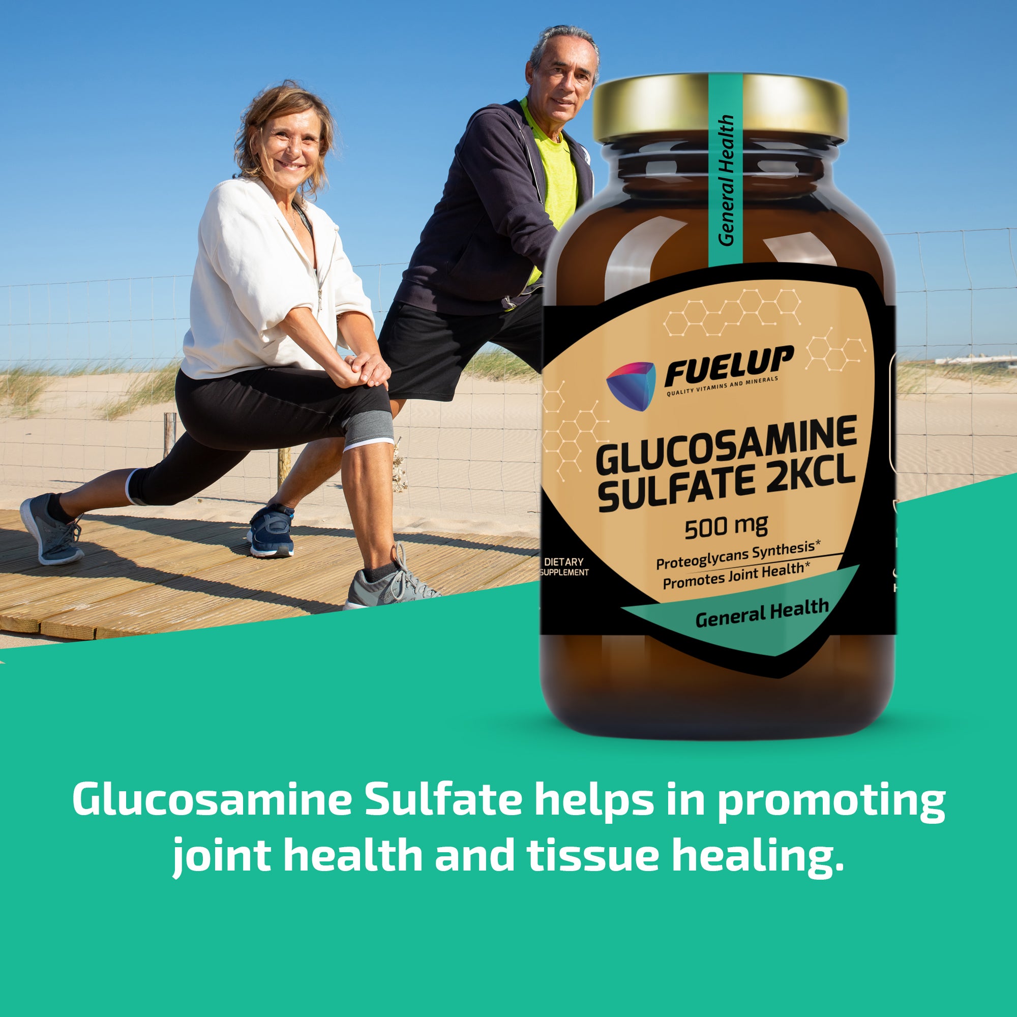 FuelUp Glucosamine Sulfate is designed to promote healthy joints and support the body’s ability to regenerate tissue. Glucosamine is a key building block in the formation of proteoglycans – structures that protect cells and aid healing processes. Ideal for those who want to maintain joint mobility and daily comfort.