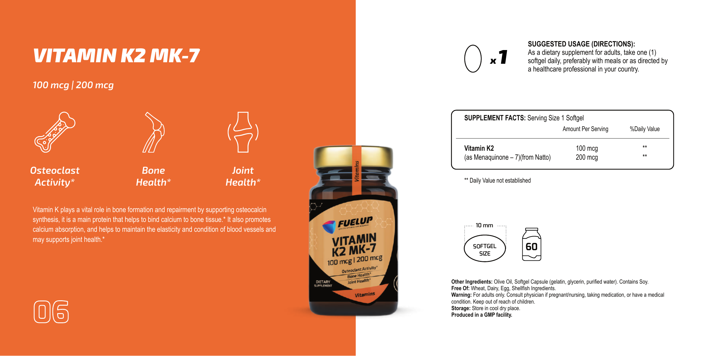 Vitamin K2 plays a crucial role in bone formation and repair by supporting osteocalcin synthesis – a protein that helps bind calcium to bone tissue. It also promotes calcium absorption, contributes to vascular elasticity, and may support healthy joint function.