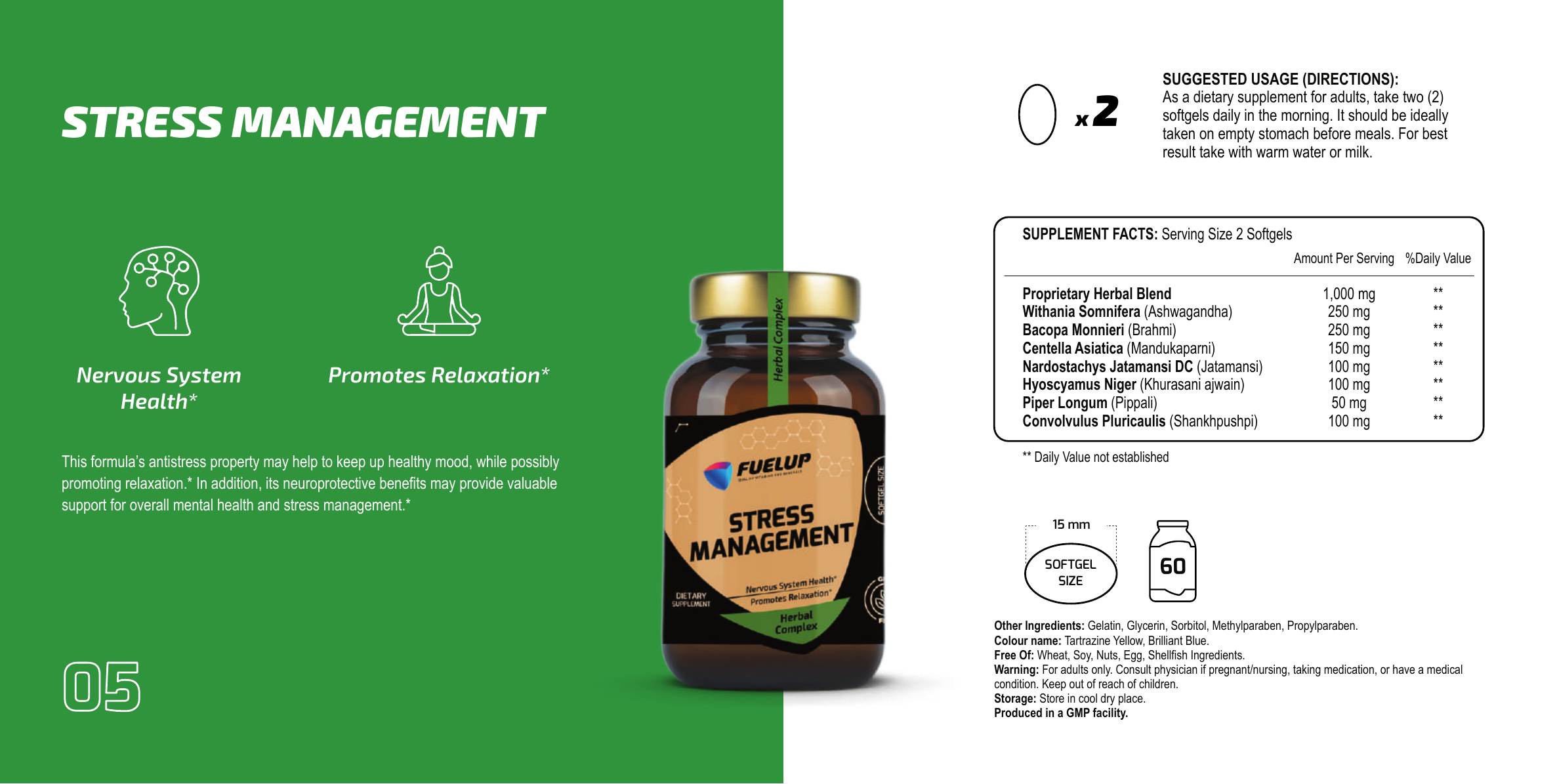 Stress Management is a herbal formula designed to promote mental balance and relaxation. The combination of adaptogenic and calming ingredients helps manage everyday stress and supports healthy nervous system function.