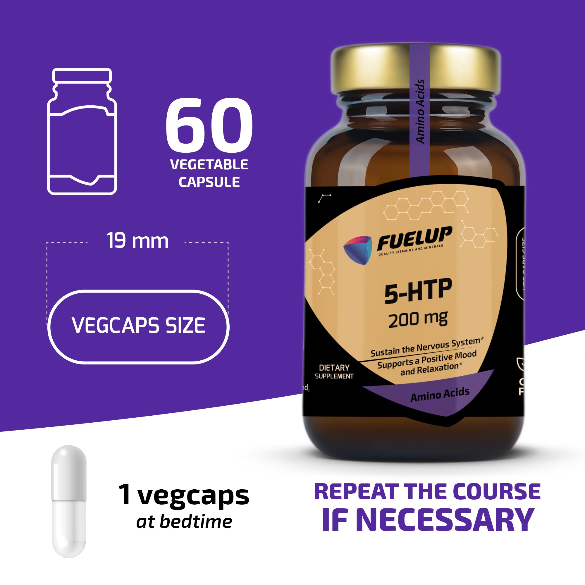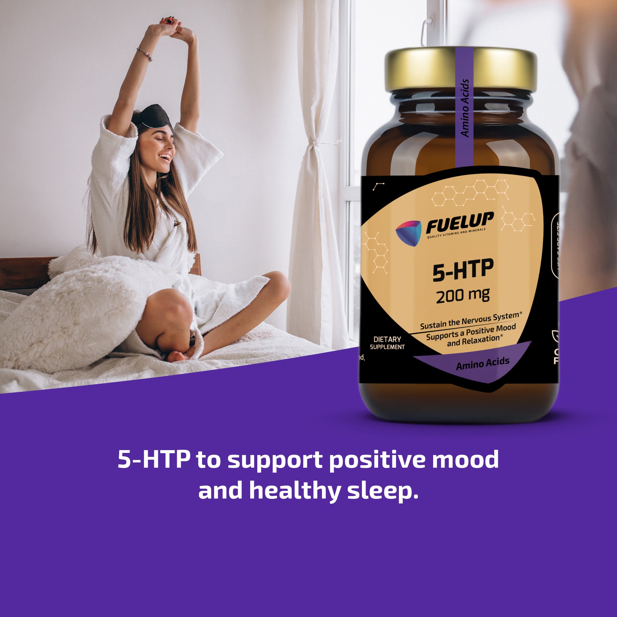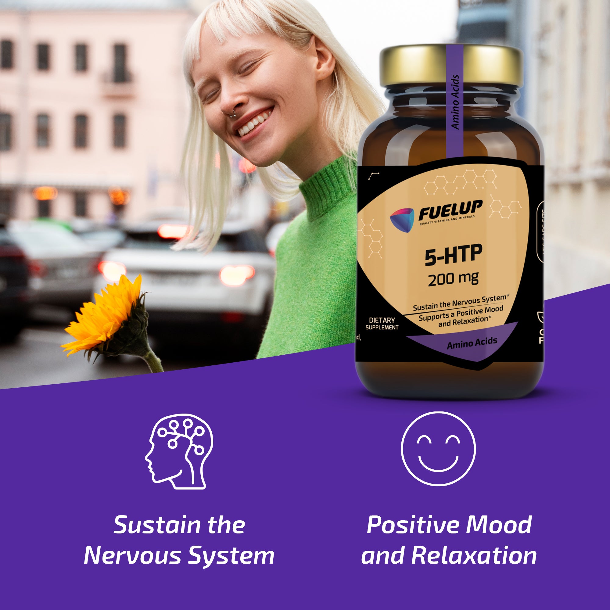 FuelUp 5-HTP is an advanced dietary supplement containing 5-hydroxytryptophan extracted from Griffonia simplicifolia seeds. This compound supports the body’s natural production of serotonin – a key neurotransmitter that helps maintain stable mood, inner calm, and healthy sleep. A smart choice during periods of stress, restlessness, or sleep difficulties.