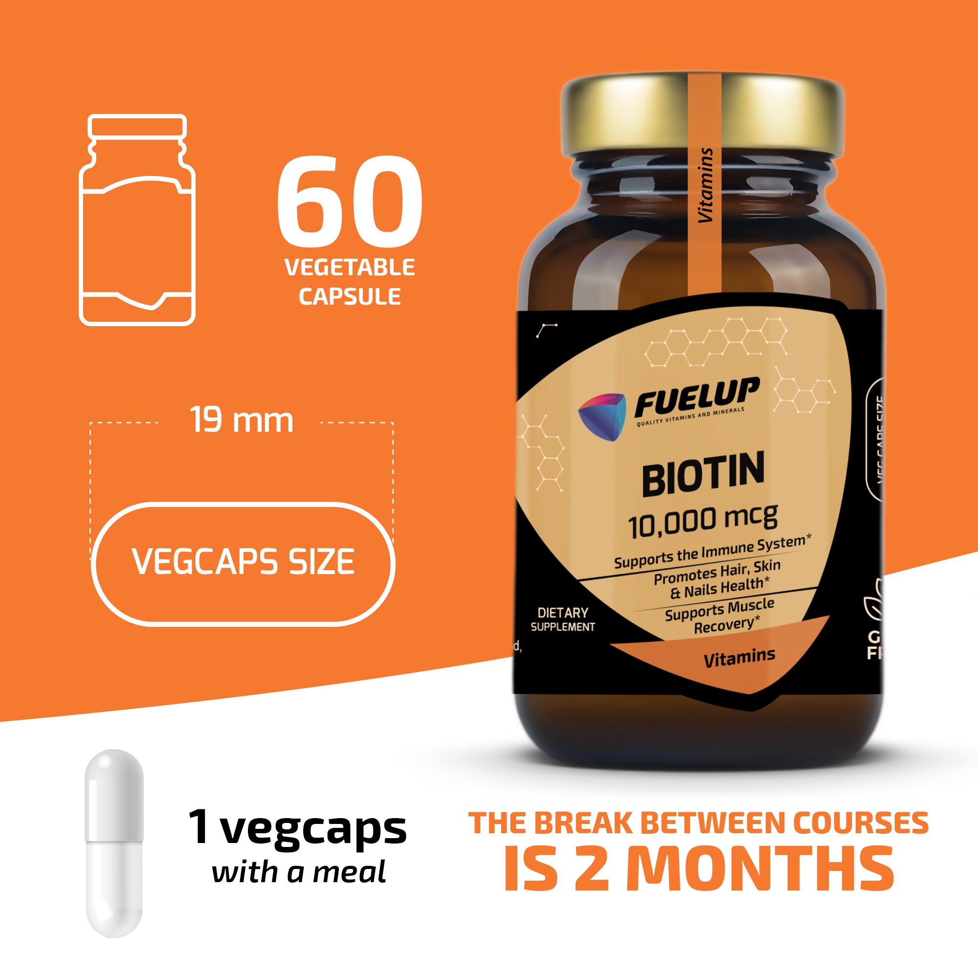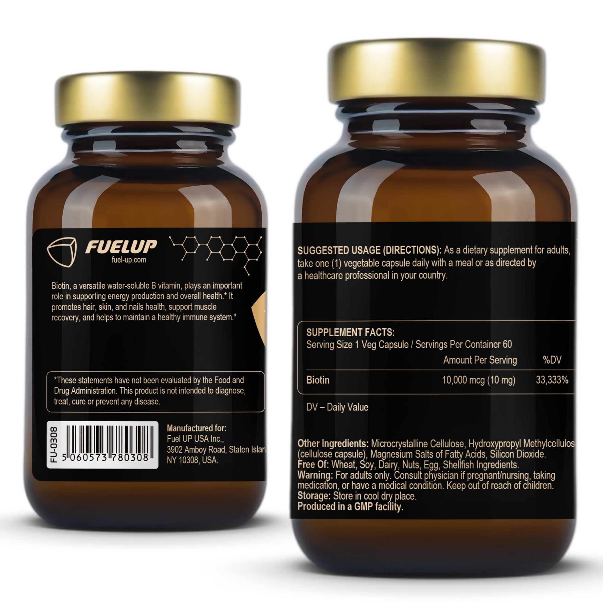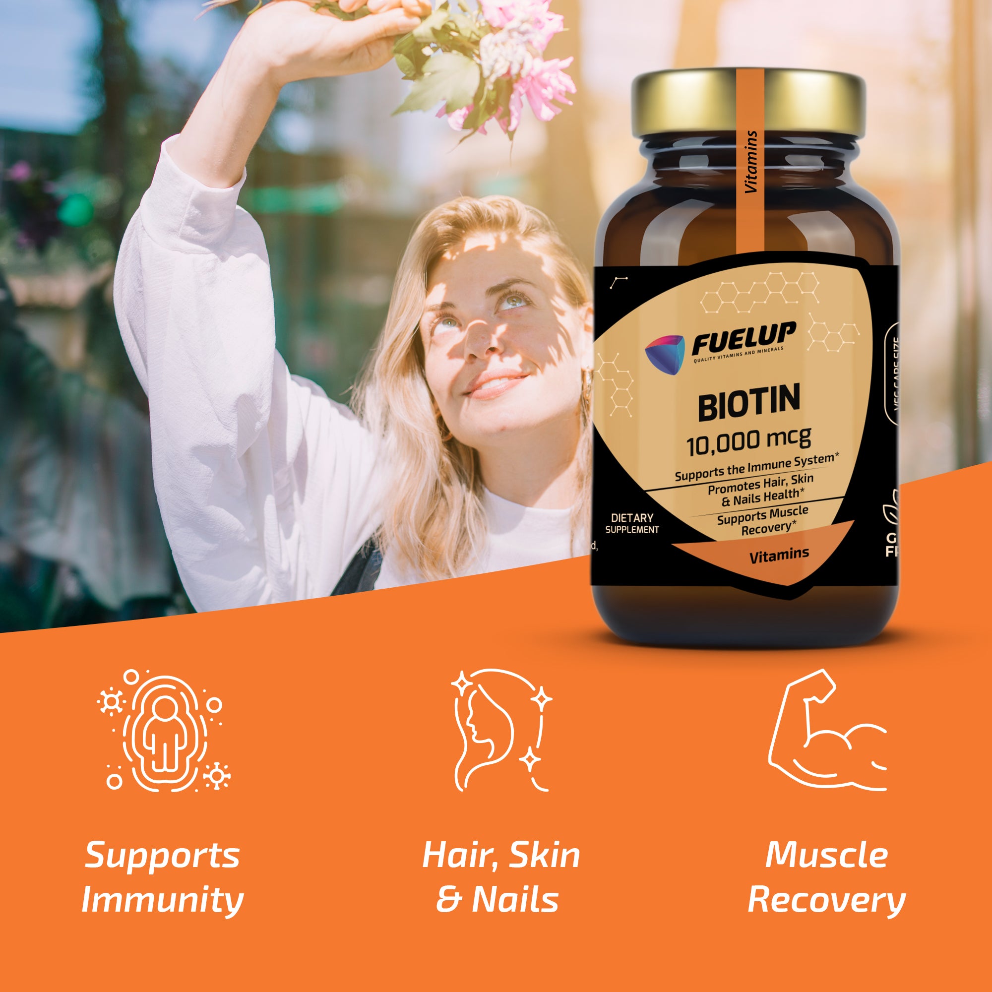 FuelUp Biotin is a potent supplement with water-soluble vitamin B7, which plays a key role in energy production and supports healthy hair, skin, and nails. It also strengthens the immune system and promotes muscle recovery.