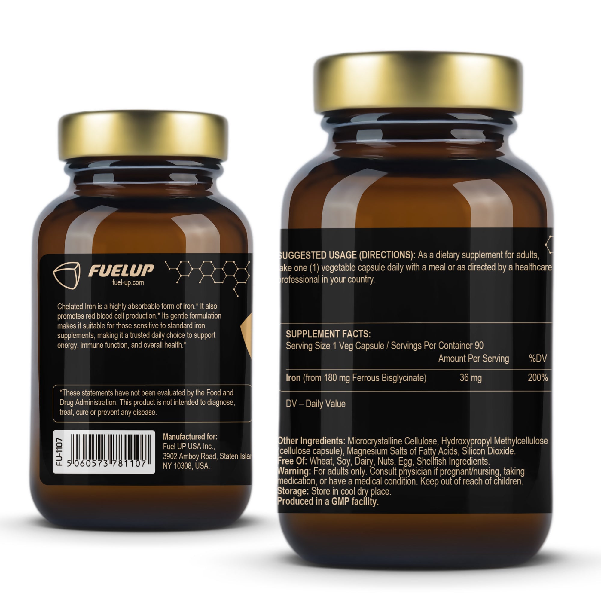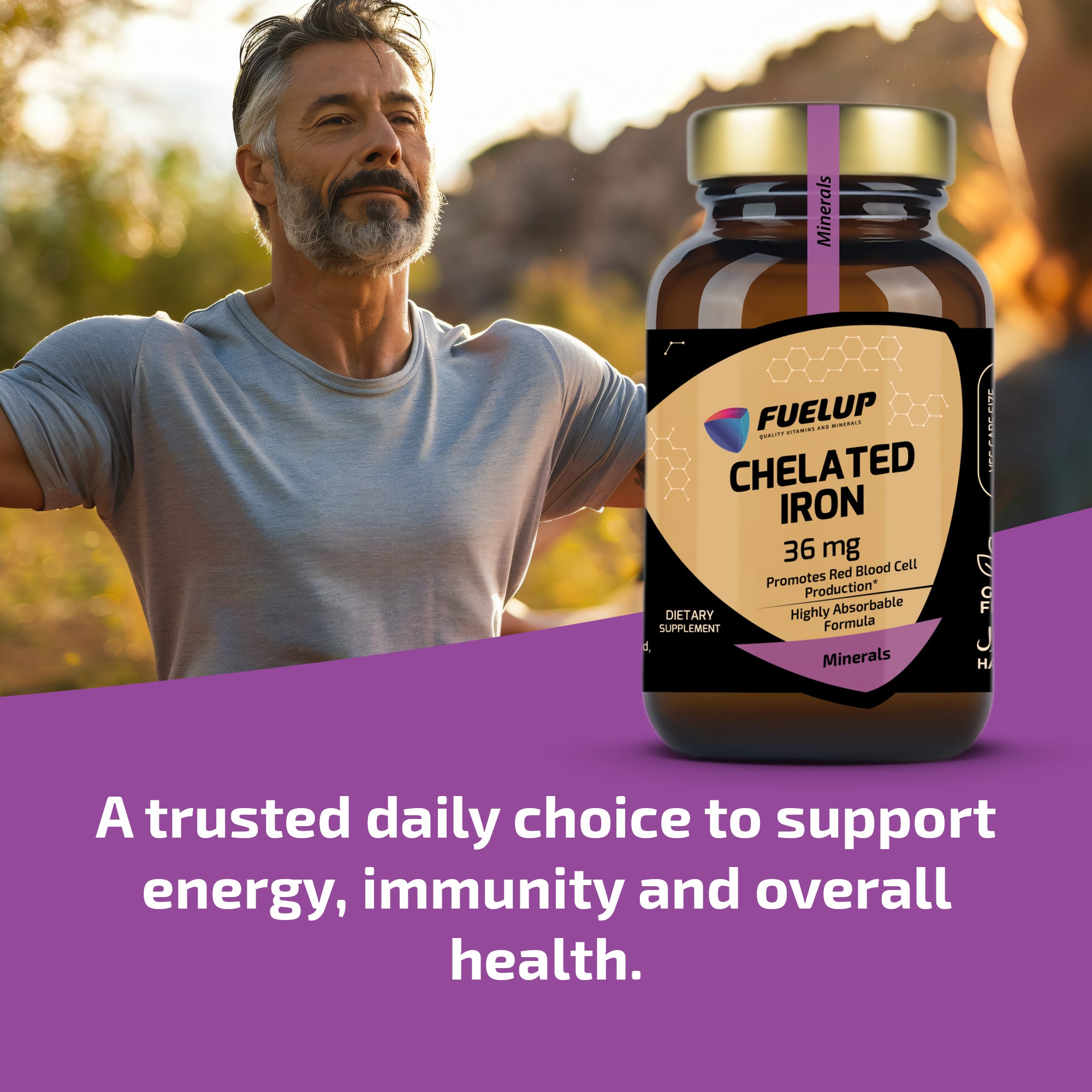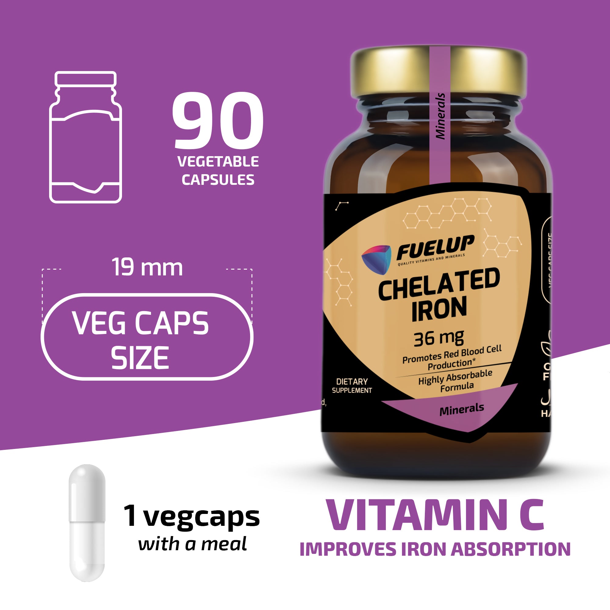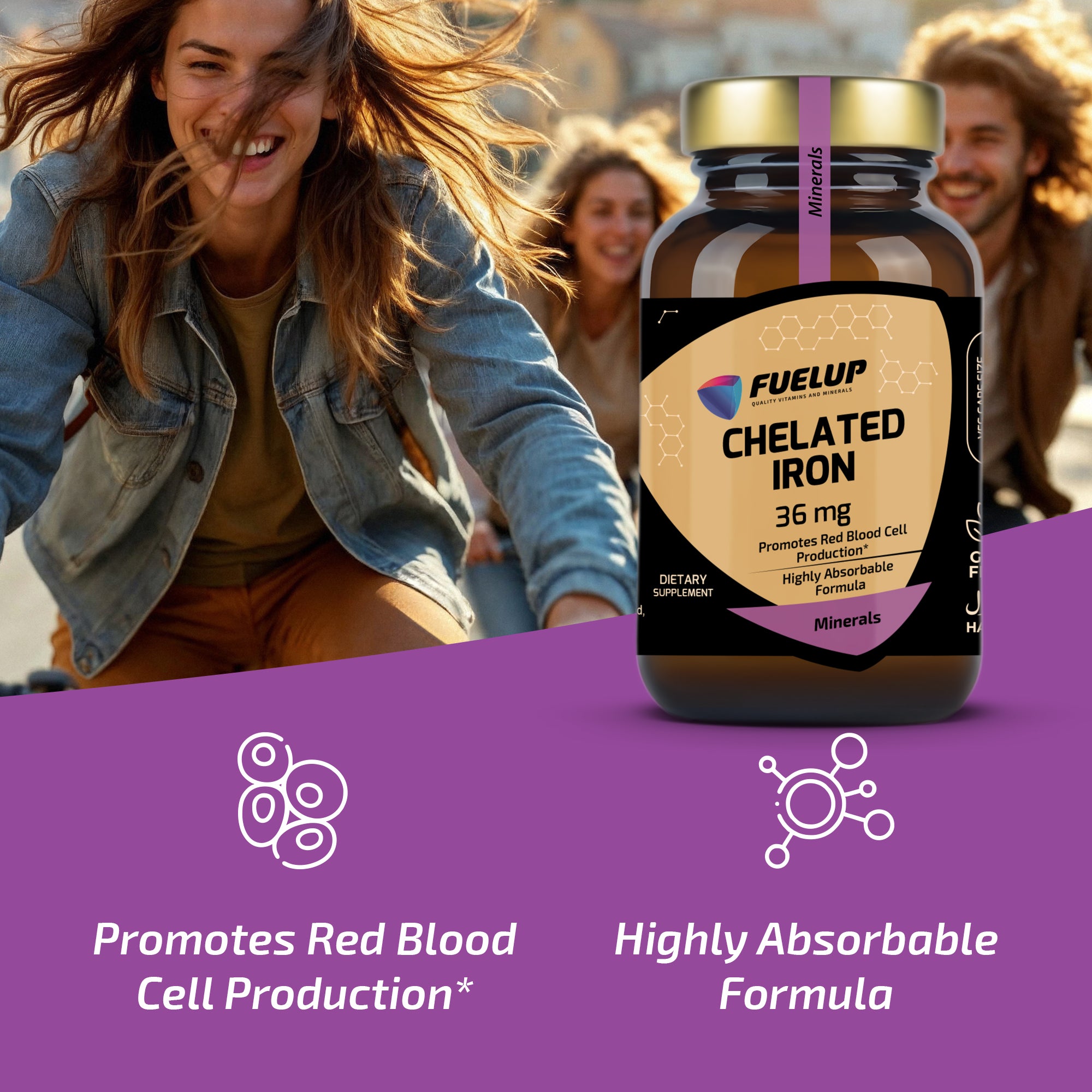 FuelUp Chelated Iron contains 36 mg of iron in a gentle and effective form (ferro-bisglycinate), known for its high bioavailability and minimal stomach irritation. It supports the formation of red blood cells, energy levels, and the immune system – perfect for daily use.