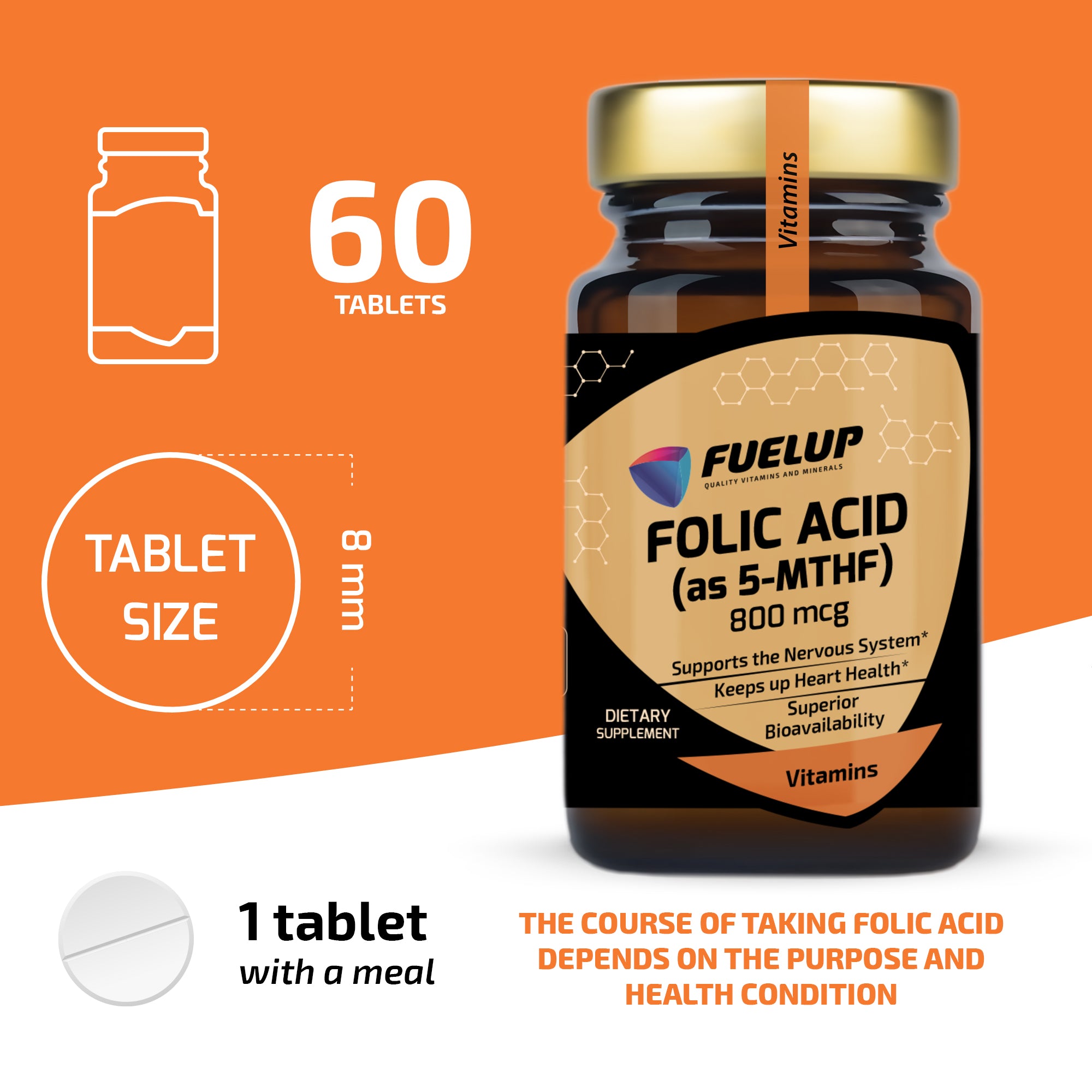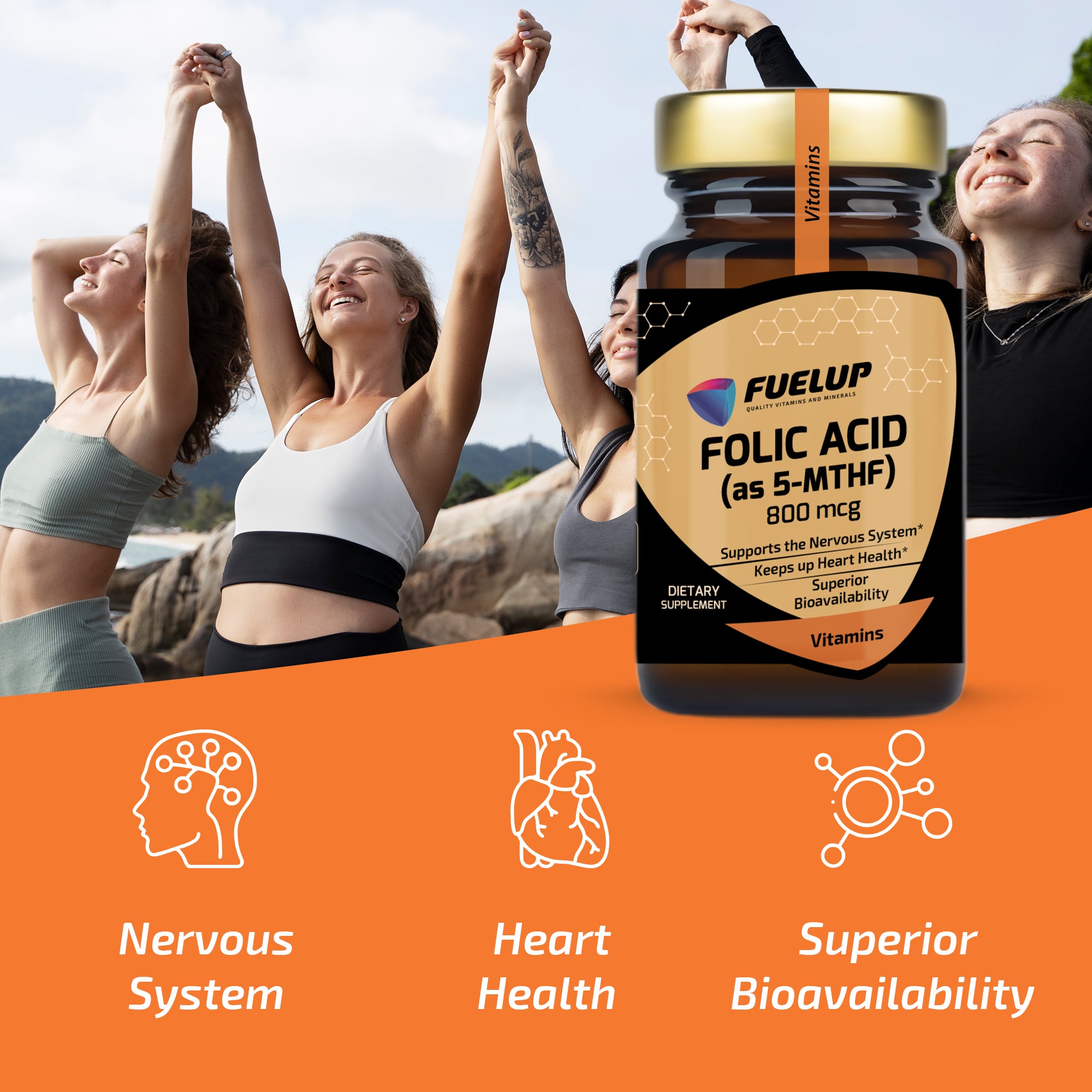 FuelUp Folic Acid contains the active form of folate (5-MTHF), which is efficiently absorbed by the body without the need for conversion. This water-soluble B vitamin plays a key role in methionine synthesis, supports the heart, and contributes to a healthy nervous system. Perfect for daily use and overall well-being.
