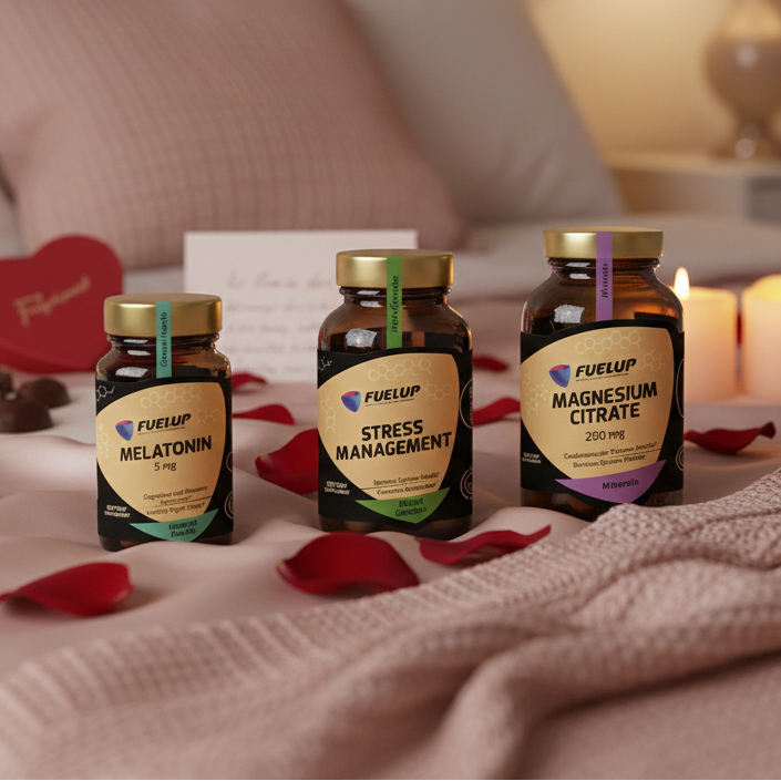 Fuel-Up Mood & Sleep is a bundle of three synergistic supplements: melatonin, magnesium citrate and a powerful adaptogen complex for stress. Together, they help reduce mental tension, improve sleep onset, and support deep, restorative rest – without morning grogginess.