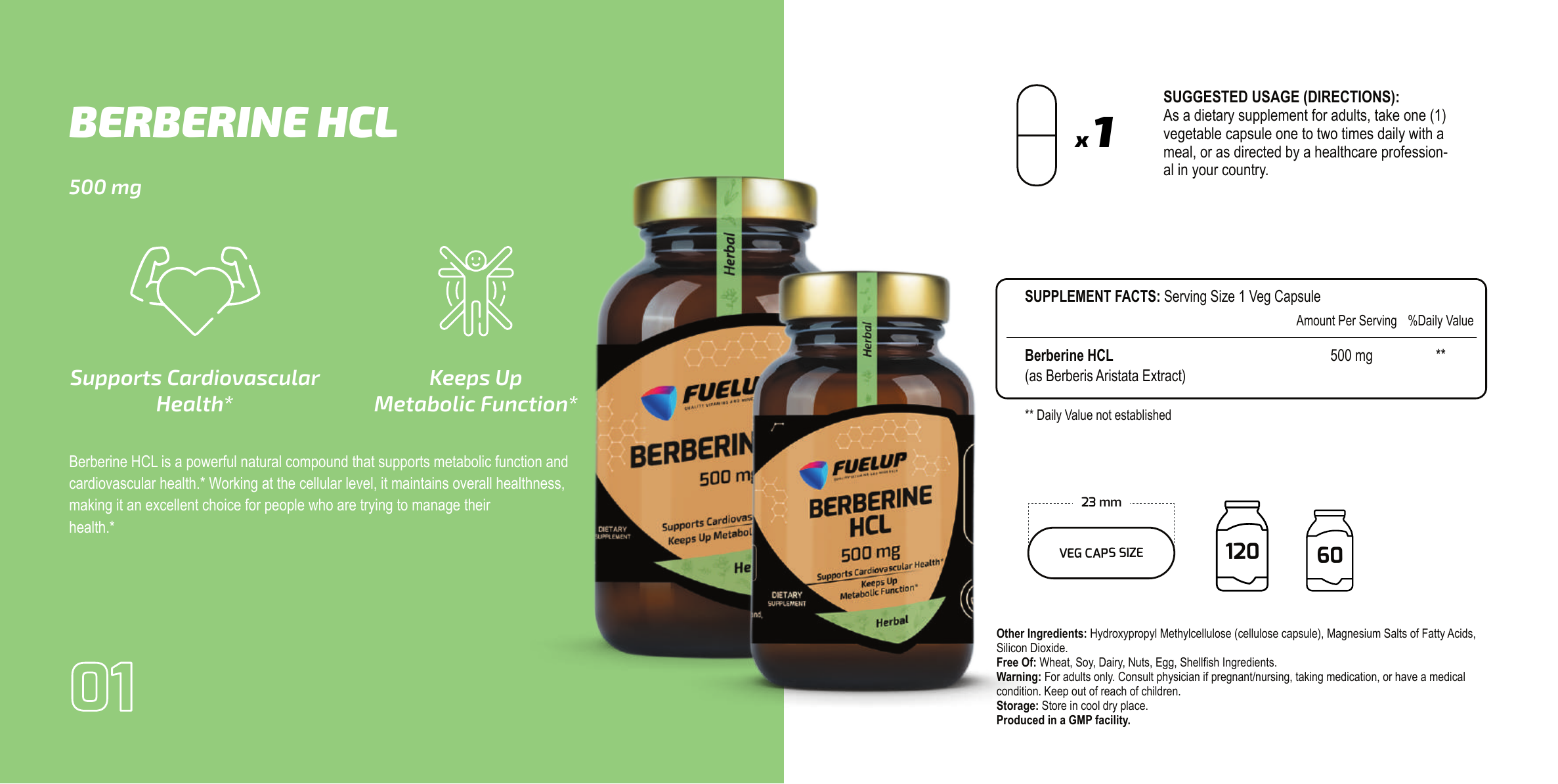 FuelUp Berberine HCL is a powerful plant-based extract from Berberis Aristata, working at the cellular level to promote healthy metabolism and heart function. Perfect for daily use by those seeking natural balance and stable blood sugar support.
