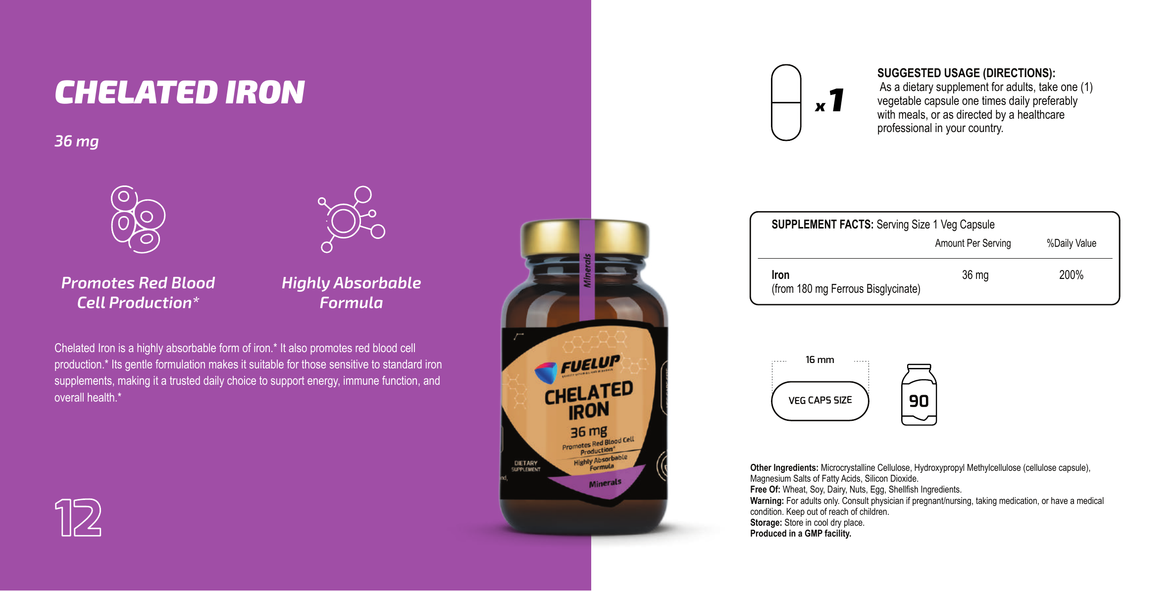 FuelUp Chelated Iron contains 36 mg of iron in a gentle and effective form (ferro-bisglycinate), known for its high bioavailability and minimal stomach irritation. It supports the formation of red blood cells, energy levels, and the immune system – perfect for daily use.
