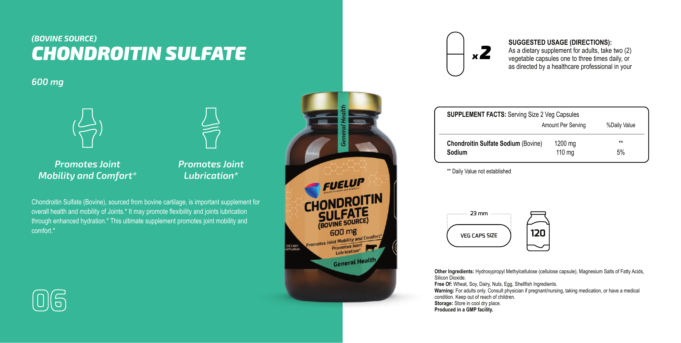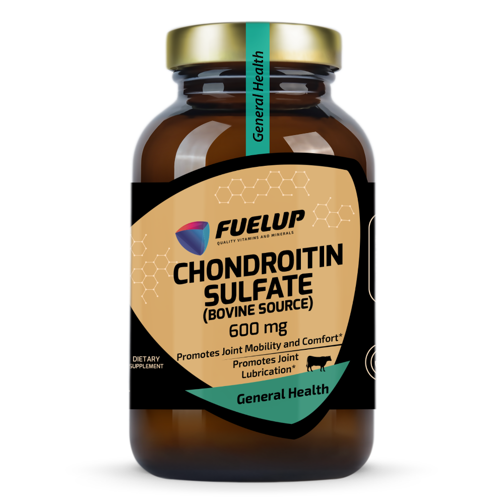 FuelUp Chondroitin Sulfate is derived from bovine cartilage and supports joint mobility, flexibility, and overall comfort. It promotes hydration and lubrication of the joints, making it ideal for active individuals and those seeking daily joint and musculoskeletal support.