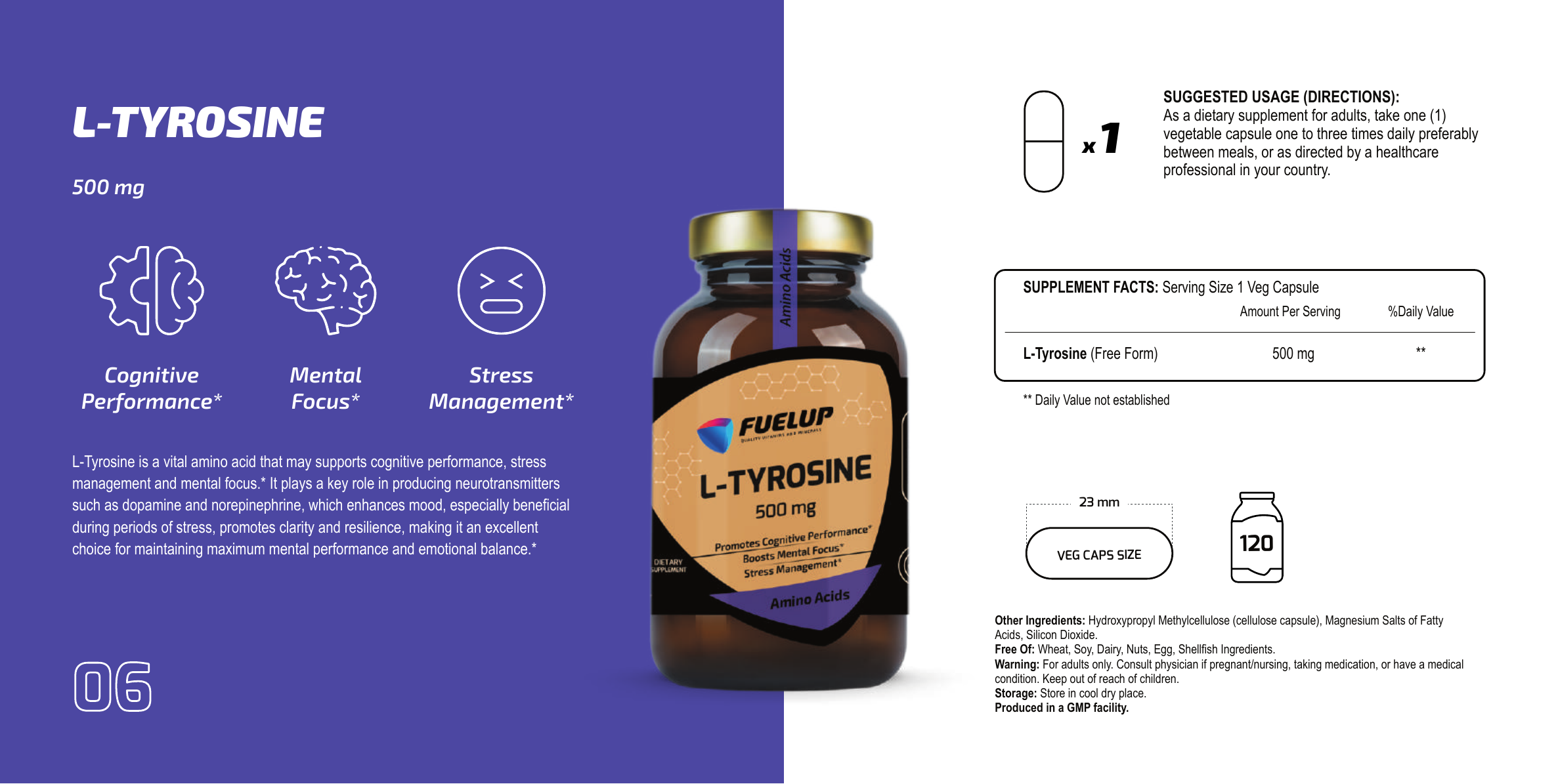 L-Tyrosine is an essential amino acid that plays a key role in the production of neurotransmitters such as dopamine and norepinephrine. It may help improve cognitive function, mental clarity, and focus—especially during periods of stress—making it ideal for those who want to maintain mental performance and emotional balance.