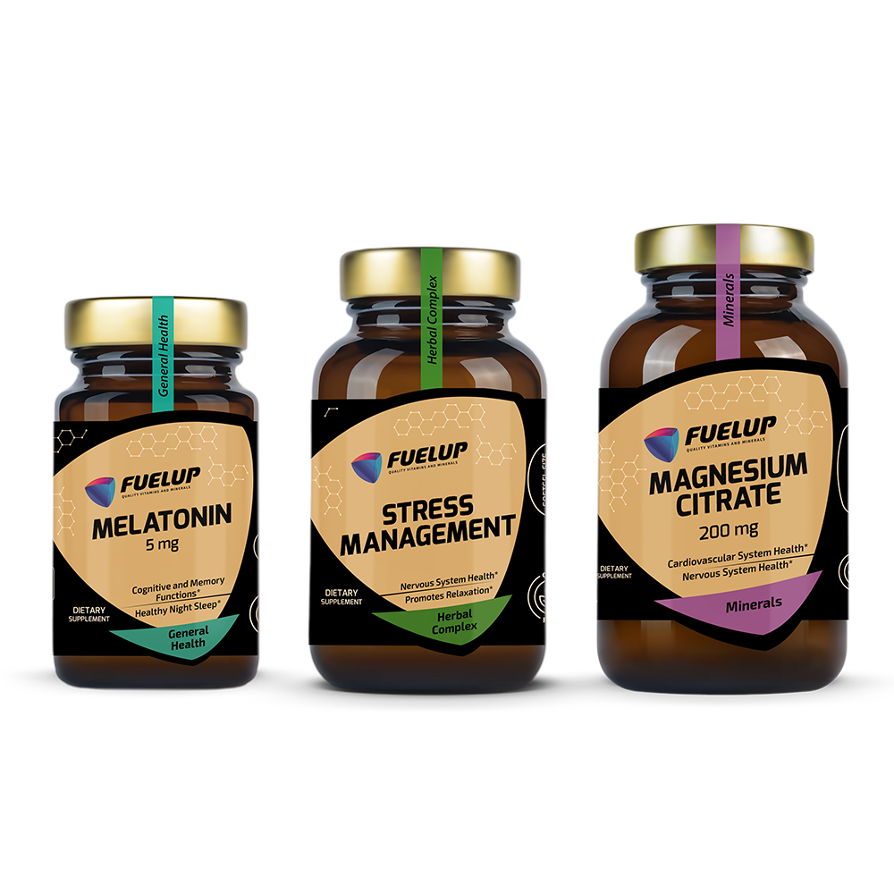 Fuel-Up Mood & Sleep is a bundle of three synergistic supplements: melatonin, magnesium citrate and a powerful adaptogen complex for stress. Together, they help reduce mental tension, improve sleep onset, and support deep, restorative rest – without morning grogginess.