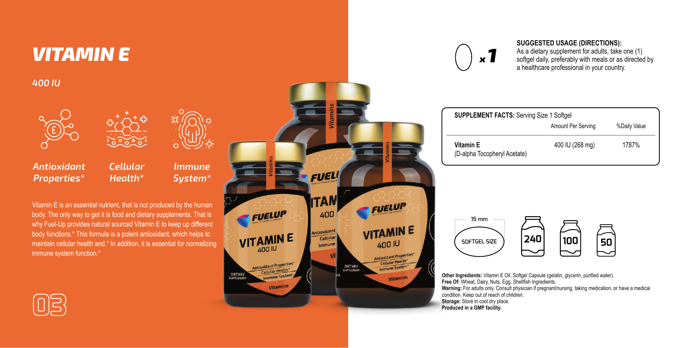 Vitamin E is an essential nutrient with strong antioxidant properties that protect the body’s cells from oxidative stress. It plays a vital role in maintaining cellular health and also supports a healthy immune system. FuelUp Vitamin E is naturally sourced and formulated for daily support of the body’s functions.